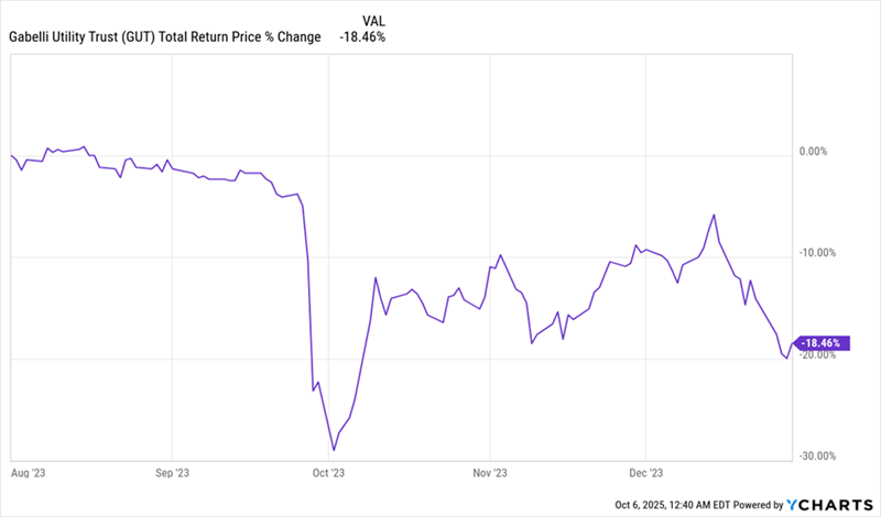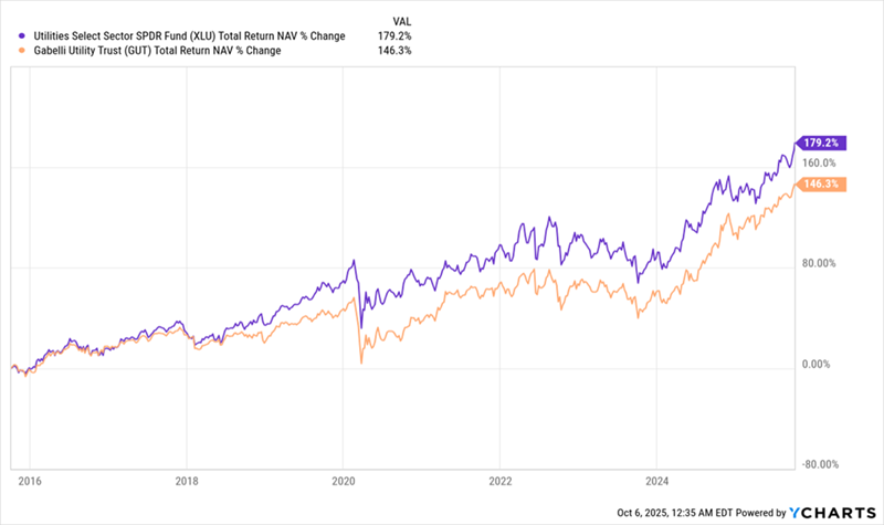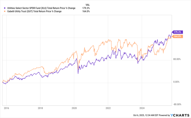 But if you’re an income investor (and if you’re reading this, there’s a good chance you are), you might be tempted by another fund—a popular utility-focused closed-end fund (CEF) called the Gabelli Utility Trust (GUT), which sports an outsized 9.9% yield and a dividend that has held steady since the early 2010s.