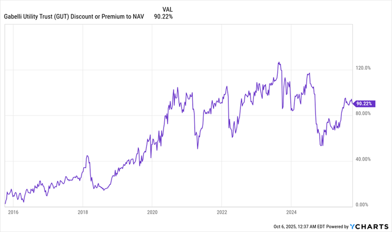 GUT has actually been slightly underperforming over the last decade, which isn’t a terrible deal: This works out to a 9.4% annualized return, which is still very decent, especially for a “low-drama” asset class like utilities. But where the rubber really hits the road on whether a CEF is a buy is at its discount to NAV, or the deal we’re getting when we buy (at the market price, of course) over the NAV.