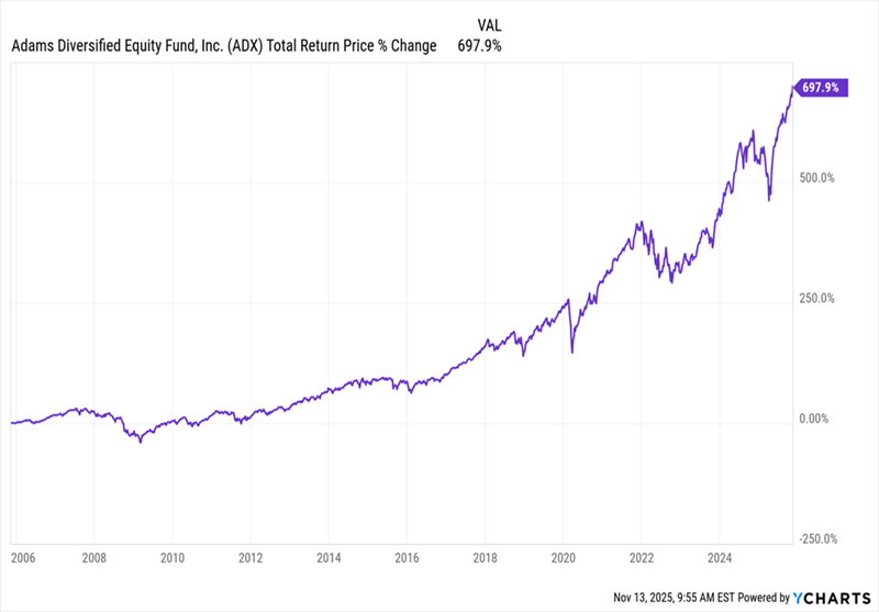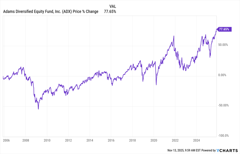 The fund has returned 700% annualized over the last 20 years. That’s pretty close to what the S&P 500 returned, but there’s a twist: ADX has paid a dividend yield that’s regularly been well north of 8% a year, compared to the S&P 500 which only pays in the 1% to 2% range.