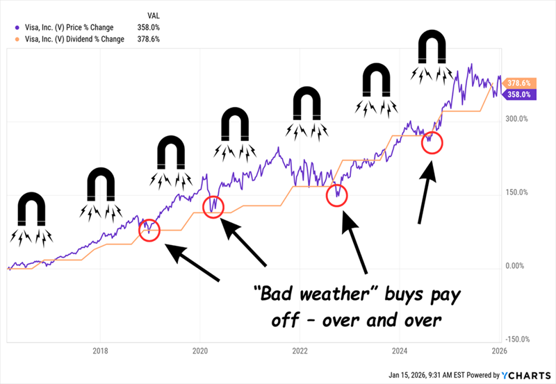 I think the chart above is clear: Those who buy Visa when the stock falls behind its dividend payout—as it is now—get an excellent shot at big “bounce-back” gains.