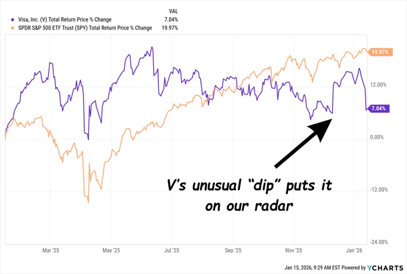 This recent lag alone will make V stand out to investors—particularly those looking to rotate out of pricey tech stocks.