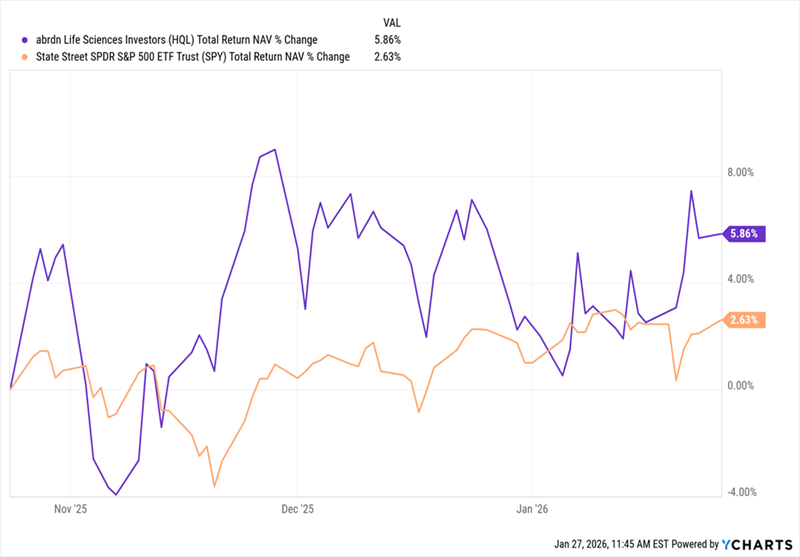 We can do that with one closed-end fund (CEF) we added to my CEF Insider service late last year: the abrdn Life Sciences Investors Fund (HQL), which yields 11.6%.