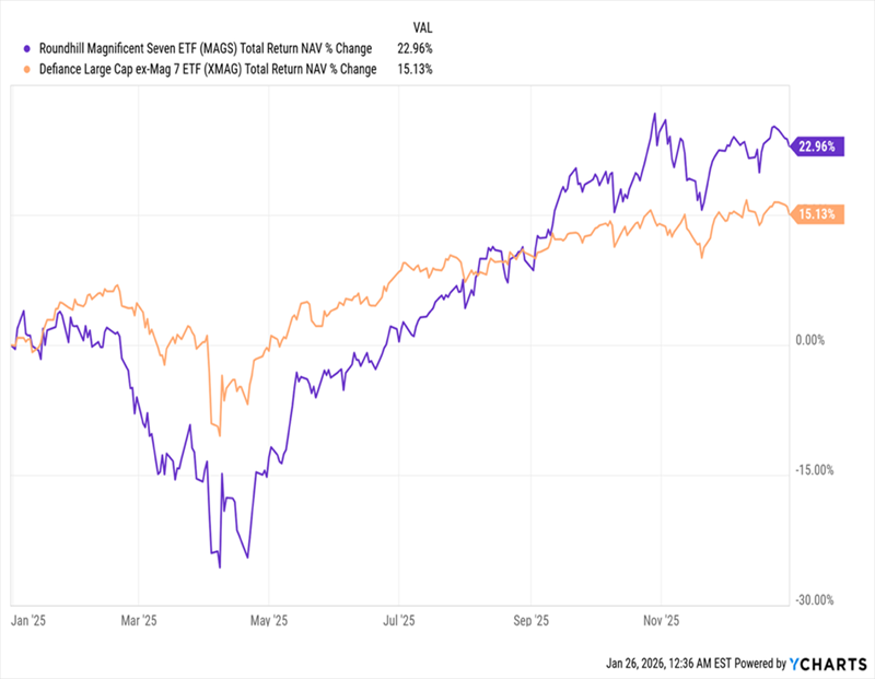 This chart compares these two ETFs’ performance in 2025. As you can see, XMAG (in orange) actually led the Mag 7 ETF (in purple) for much of the year, and only trailed by seven points at year-end.