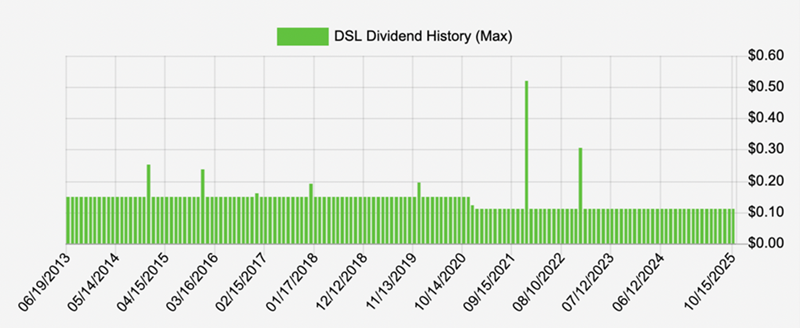 Moreover, longer-duration bonds will likely rise in value as rates fall. That’ll juice DSL’s portfolio and its divvie, which has rolled in steadily since inception, only pulling back a bit in the COVID chaos. And as you can see, big special dividends abound: