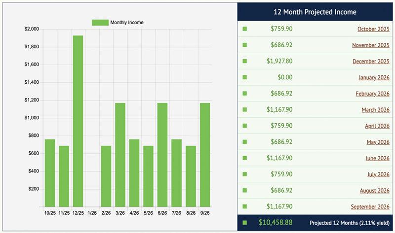 We’ll dive into three strong monthly payers that are precisely the right tools for this job below. First, let’s split our $500K among them and flip them into Income Calendar so we can see what kind of monthly dividend we can expect: