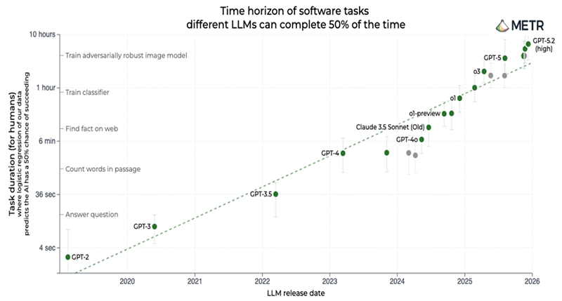 This is a pretty popular (and controversial) chart in the AI world. It tracks how long of a task an AI model can successfully perform. Right now, it shows that our third-best model can perform a task that would normally require 6.6 hours of human labor.