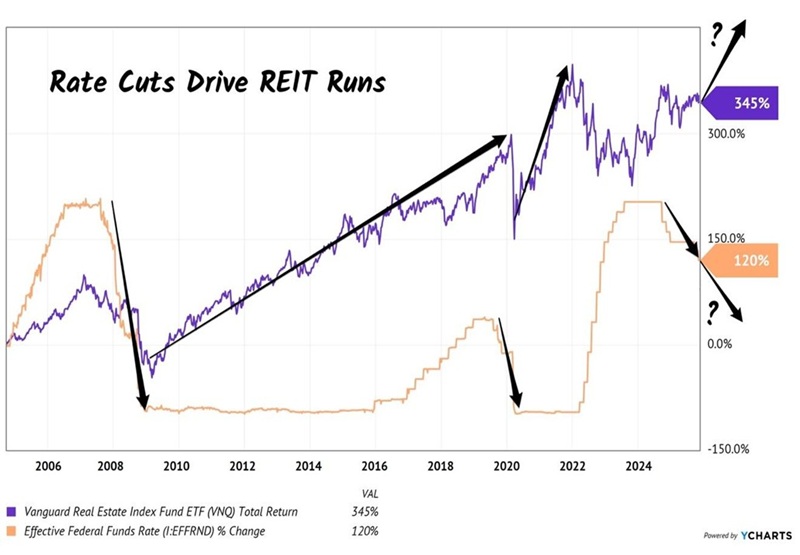 Meanwhile, that “safe 4%” money-market yield everyone fell in love with? It’s going away. Every Fed cut pushes more idle cash into the market, searching for yields with actual staying power. REITs, obligated to hand 90% of their income to us, thrive in times like these.